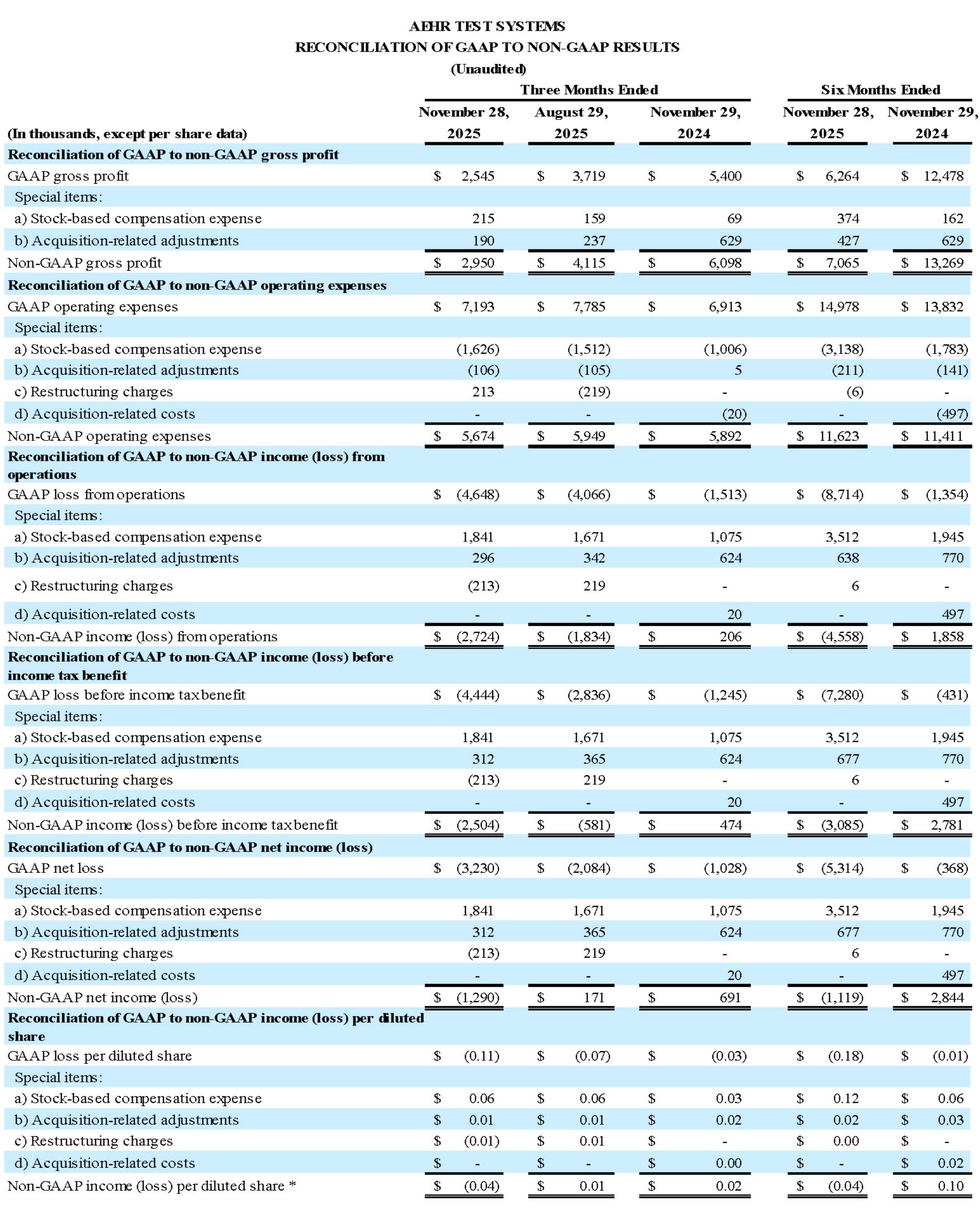 An explanation of the use of non-GAAP financial measures and a reconciliation of Aehr’s non-GAAP financial measures to the most directly comparable GAAP financial measures can be found in the accompanying tables.