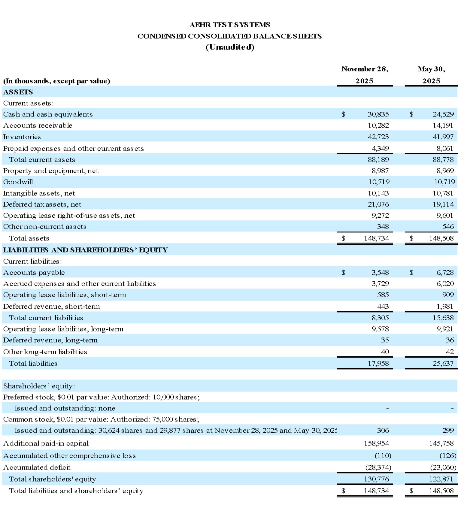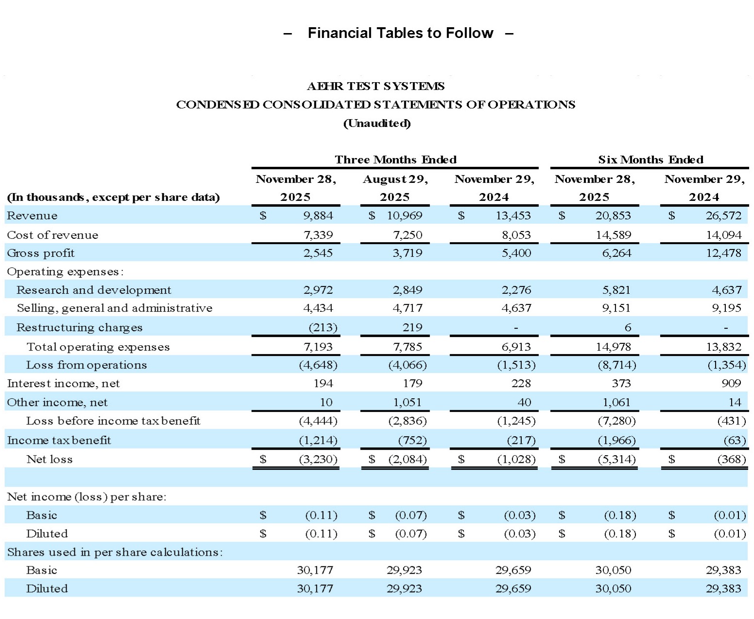 For the second half of fiscal year 2026 that began November 29, 2025 and ends May 29, 2026, Aehr expects revenue between $25 million and $30 million and non-GAAP net loss per diluted share between $(0.09) and $(0.05).