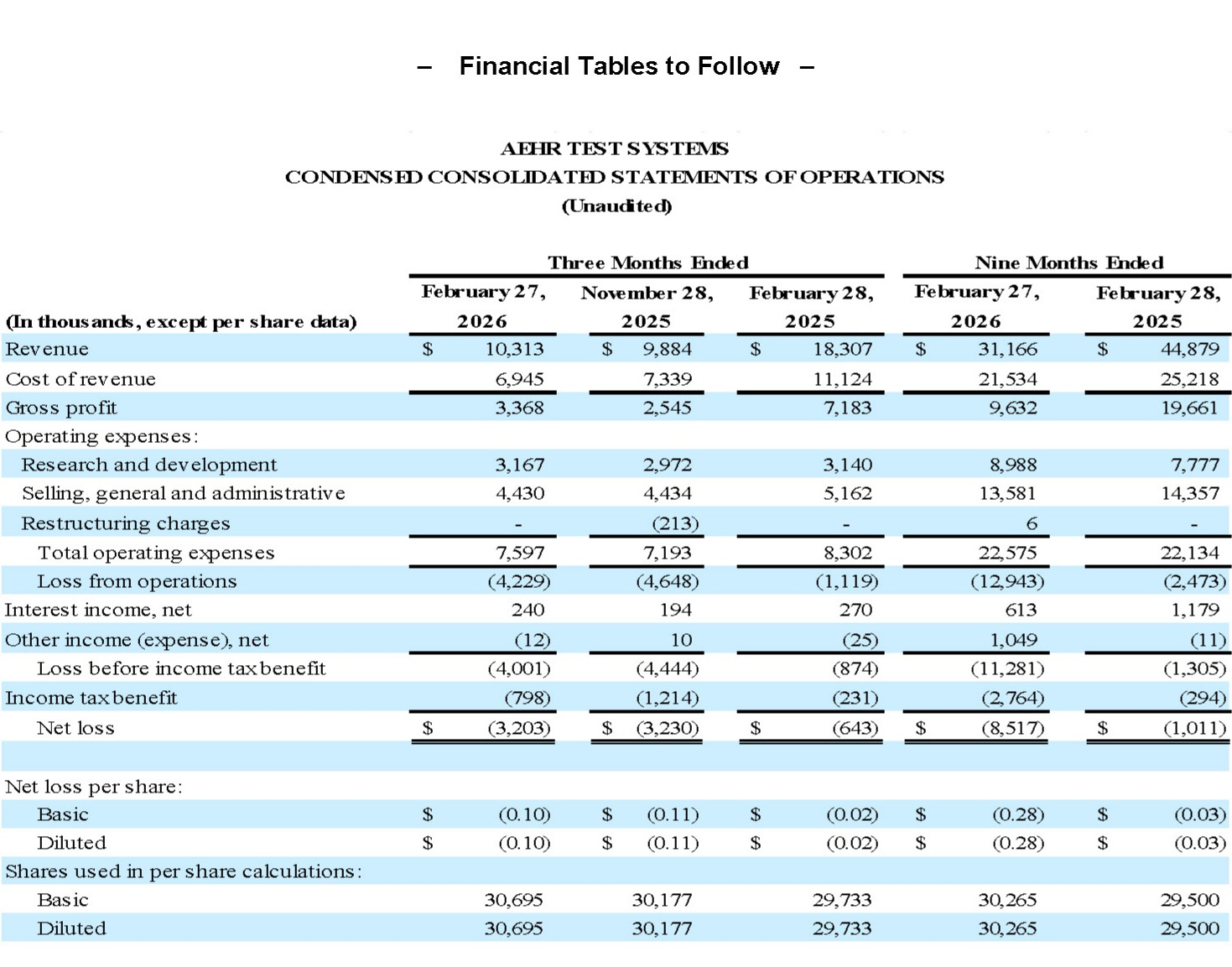 Fremont, CA (April 7, 2026) – Aehr Test Systems (NASDAQ: AEHR), a leading provider of test and burn-in solutions for semiconductor devices used in artificial intelligence (AI), data center, automotive, and industrial applications, today announced financial results for its third quarter of fiscal 2026, ended February 27, 2026.