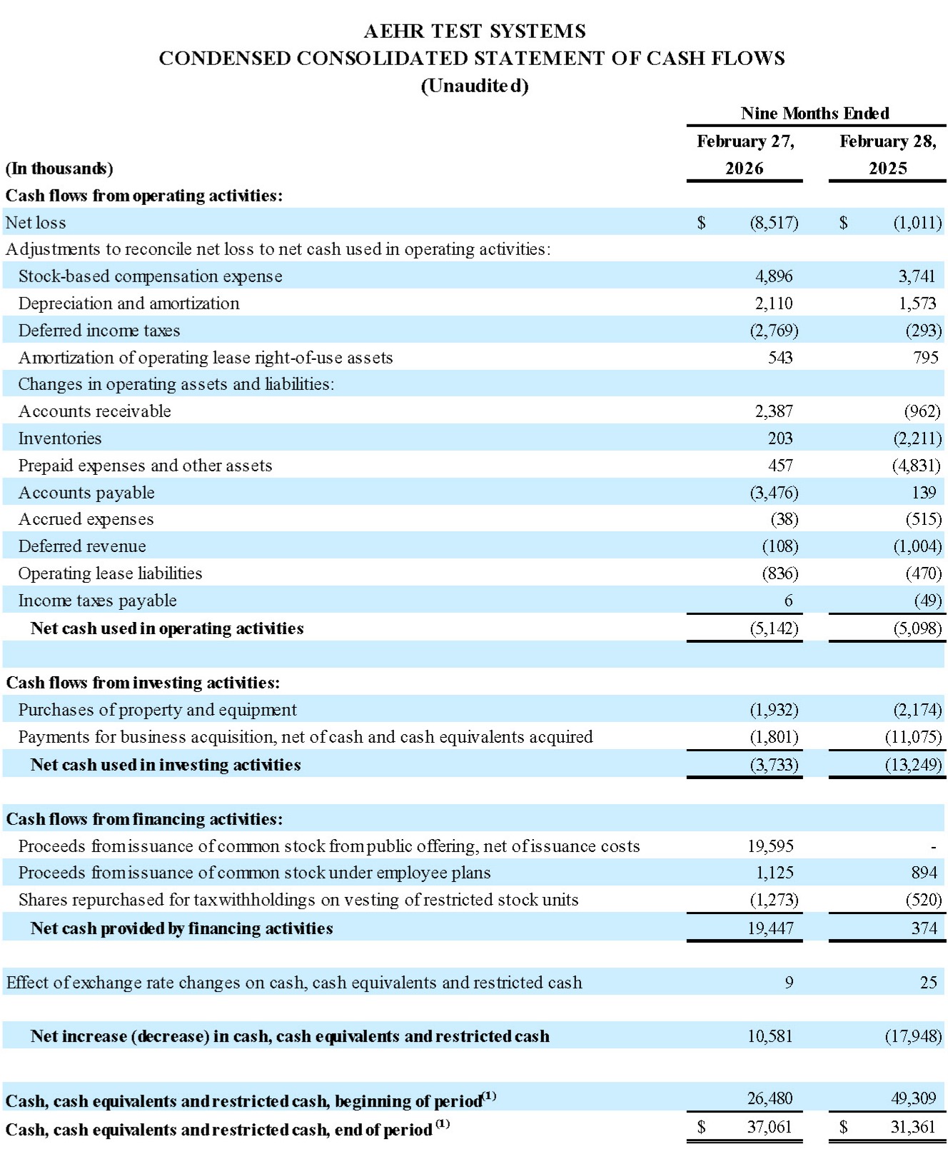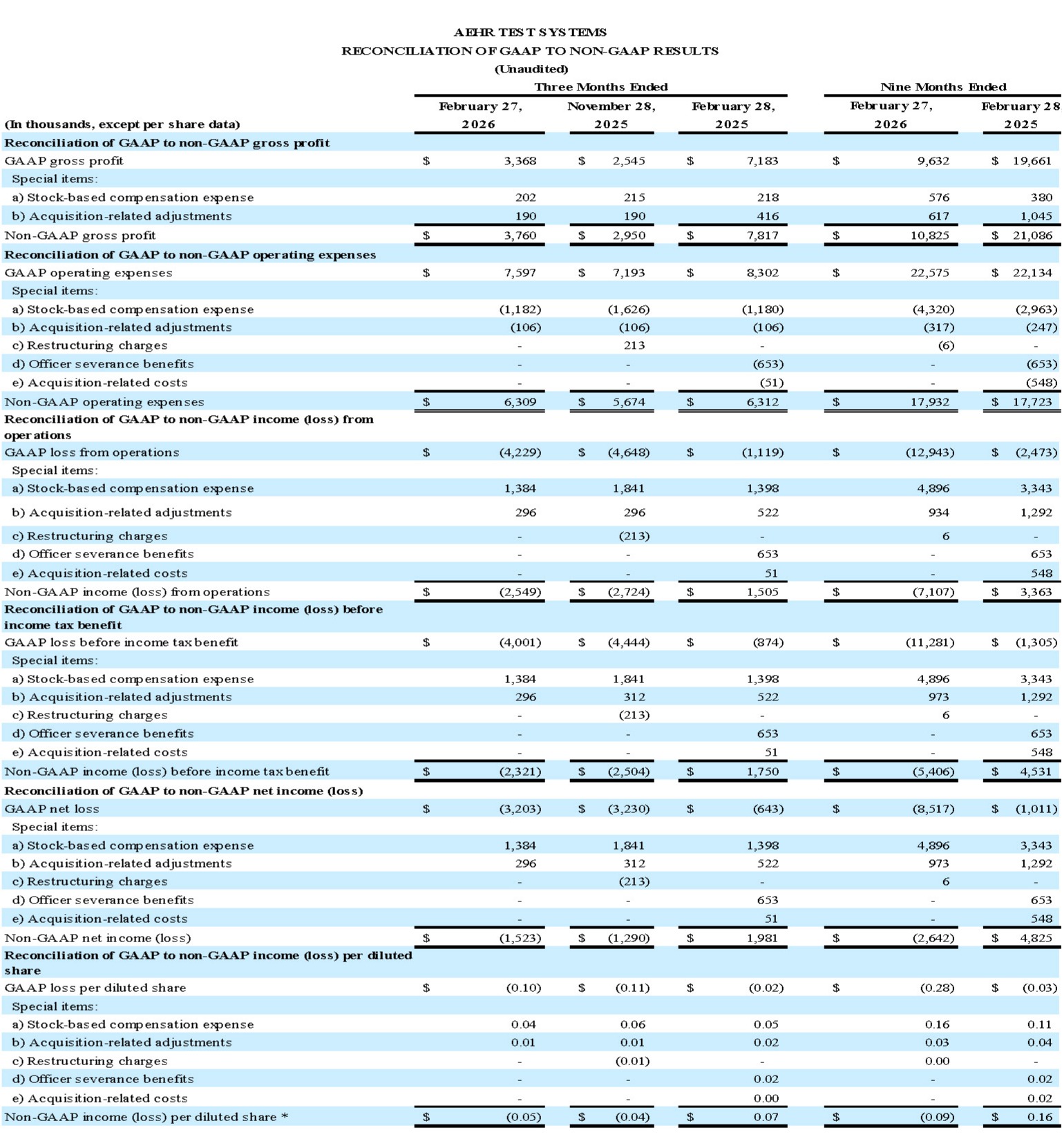 An explanation of the use of non-GAAP financial measures and a reconciliation of Aehr’s non-GAAP financial measures to the most directly comparable GAAP financial measures can be found in the accompanying tables.