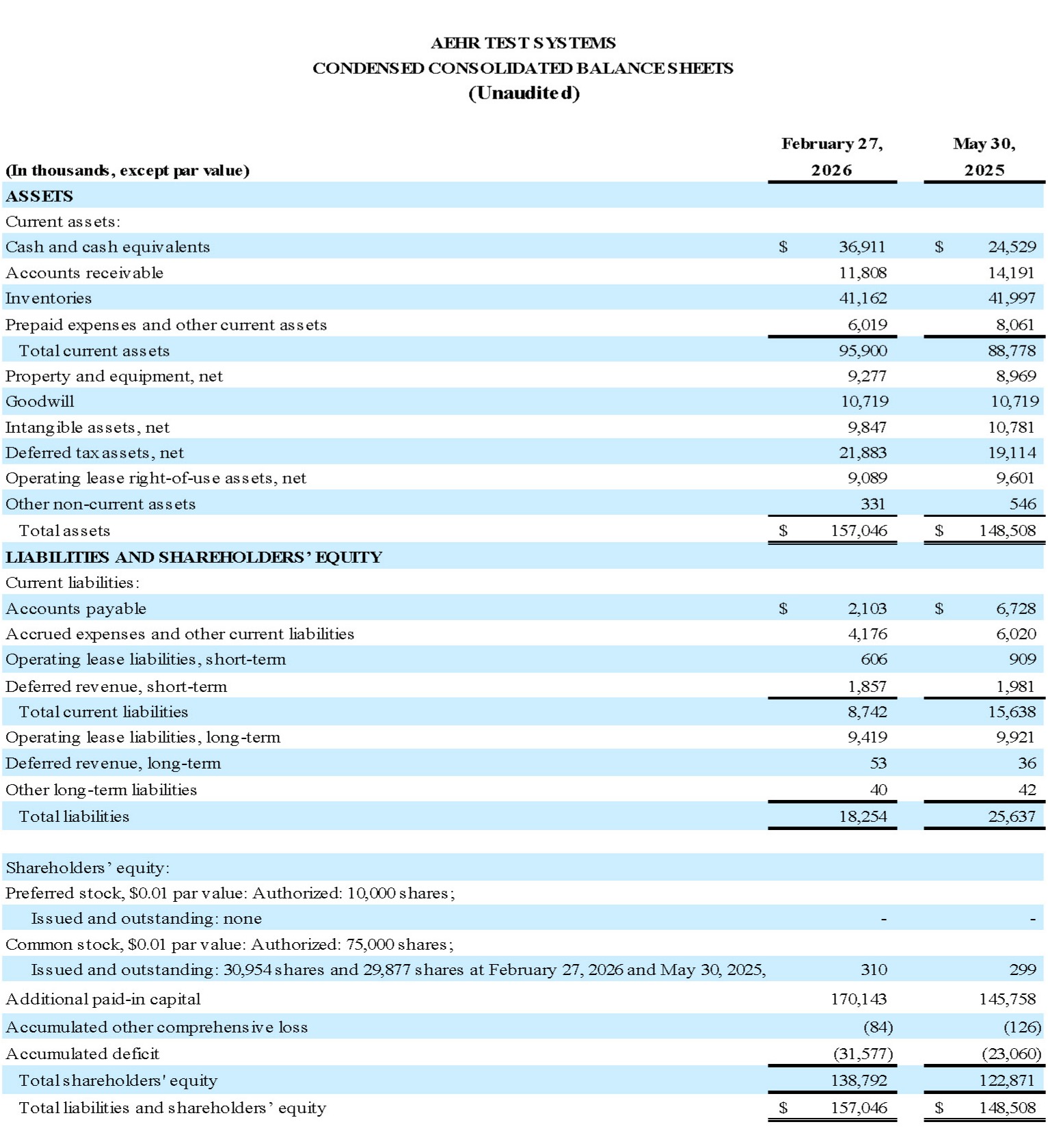 This press release contains certain forward-looking statements within the meaning of Section 27A of the Securities Act of 1933 and Section 21E of the Securities Exchange Act of 1934. Forward-looking statements generally relate to future events or Aehr’s future financial or operating performance. In some cases, you can identify forward-looking statements because they contain words such as “may,” “will,” “should,” “expects,” “plans,” “anticipates,” “going to,” “could,” “intends,” “target,” “projects,” “contemplates,” “believes,” “estimates,” “predicts,” “potential,” or “continue,” or the negative of these words or other similar terms or expressions that concern Aehr’s expectations, strategy, priorities, plans, or intentions. Forward-looking statements in this press release include, but are not limited to, future bookings, benchmark evaluations and product development from Aehr’s new and existing customers; future applications and orders for the AI processors, test solutions for AI semiconductor manufacturers and the Sonoma system; revenue and revenue growth forecasted; financial performance and bookings forecasted; financial guidance for the second half of fiscal 2026 and the full fiscal year 2027; expectations regarding current and future partnerships; expectations regarding industry demand and emerging technologies as a whole and smaller segments within it; and the ability for Aehr to successfully enter new markets. The forward-looking statements contained in this press release are also subject to other risks and uncertainties, including those more fully described in Aehr’s recent Form 10-K, 10-Q and other reports filed from time to time with the Securities and Exchange Commission. Aehr disclaims any obligation to update information contained in any forward-looking statement to reflect events or circumstances occurring after the date of this press release.
